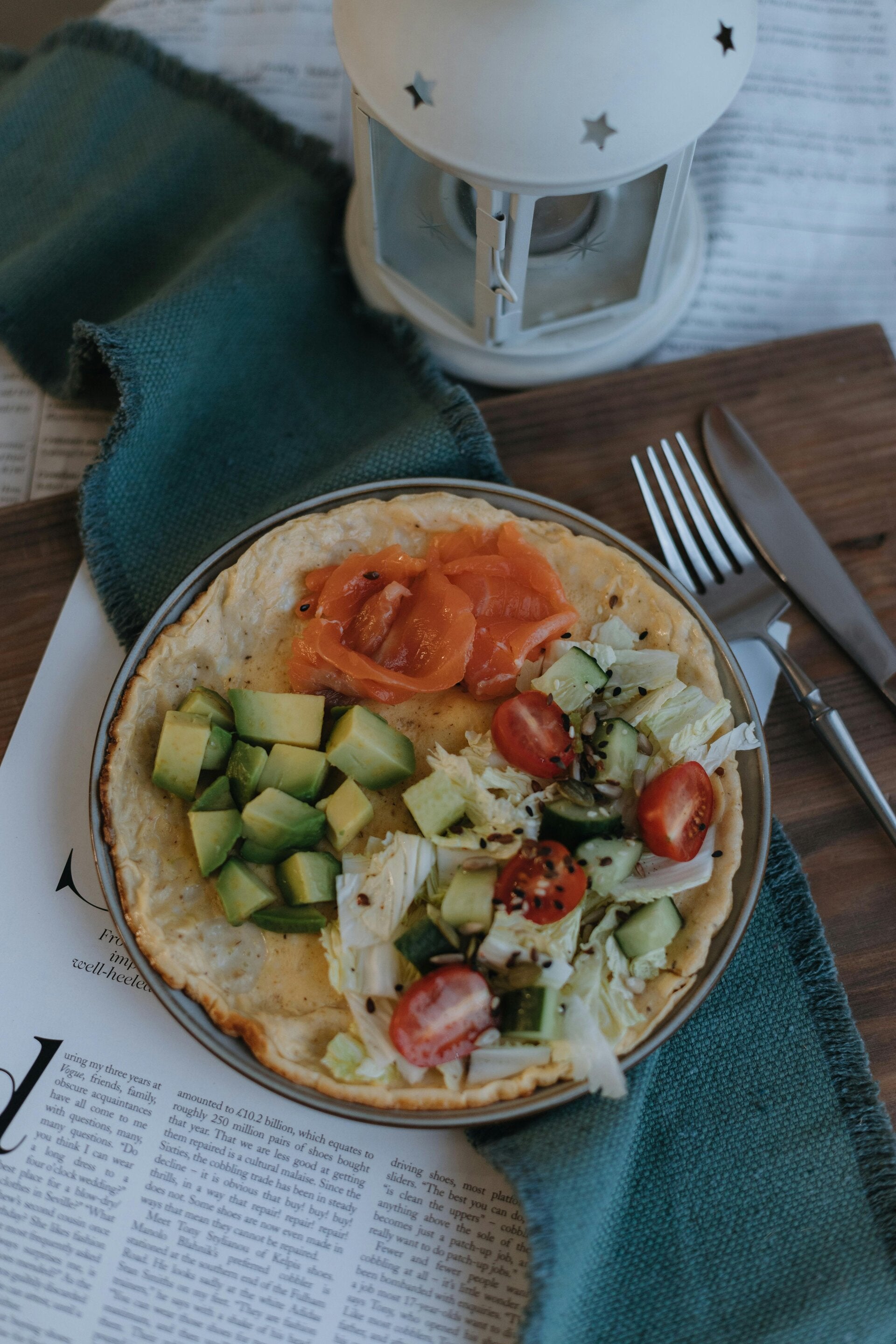 5. haal de wrap van het vuur en garneer met de groenten en de zalm.